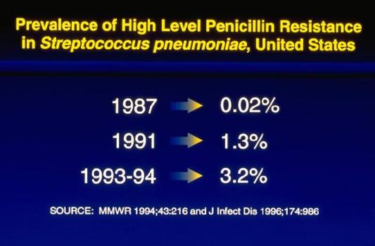 This image was produced, by the Centers for Disease Control and Prevention (CDC) in 1997, It lists the percentages of penicillin resistant S. pneumoniae infections, during 1987, 1991, and 1993-94, based on data collected by both the Morbidity and Mortality Weekly Report (MMWR), The Journal of Infectious Diseases. Note how over this 8-year period, there was a steady increase in the occurrence of high level penicillin resistance. public domain